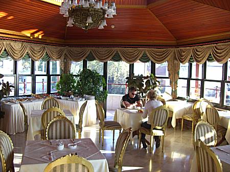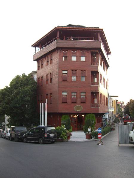 Hotel Valide Sultan Konagi mit Holz verschalt. Ganz oben Restaurant